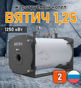 «Вятич 1,25» — водогрейный жаротрубно-дымогарный котел мощностью 1,25 МВт с реверсивной топкой. Котел «Вятич», в зависимости от типа горелочного устройства, может работать на природном газе или жидком топливе и выполнен в газоплотном исполнении с работой под наддувом.